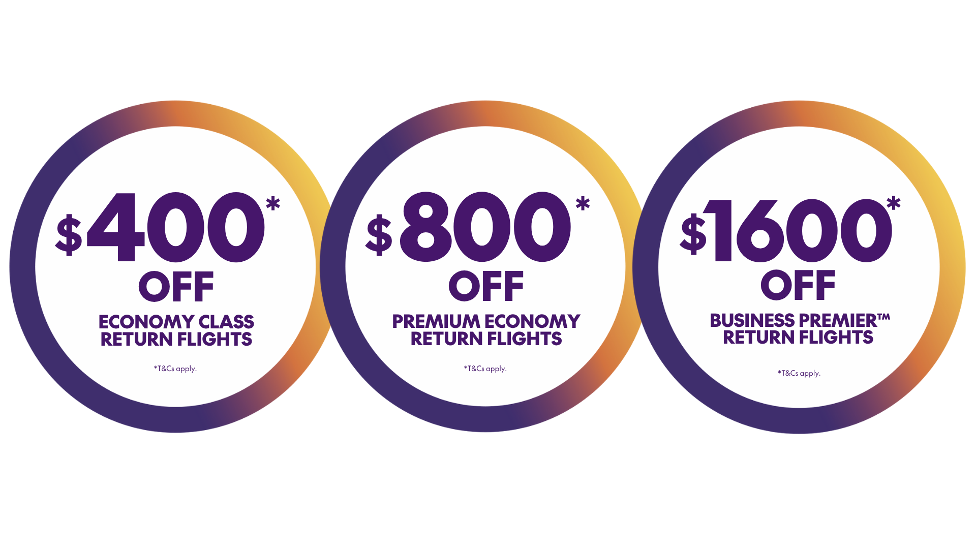 TRAVEL PERIOD: Economy Class return: Low season: 20 Oct-10 Dec 25, 15 Jan-28 Mar, 21 Apr-26 Jun & 20 Jul-14 Sep 26. Shoulder season: 11-14 Dec, 29 Mar-01 Apr, 27 Jun-01 Jul & 15-18 Sep 26. Premium Economy return: Blackout: 29 Mar-04 Apr, 01-17 July (either direction). Business Premier return: Blackout: 29 Mar-04 Apr, 01-17 July (either direction). Book instore only. T&Cs apply.