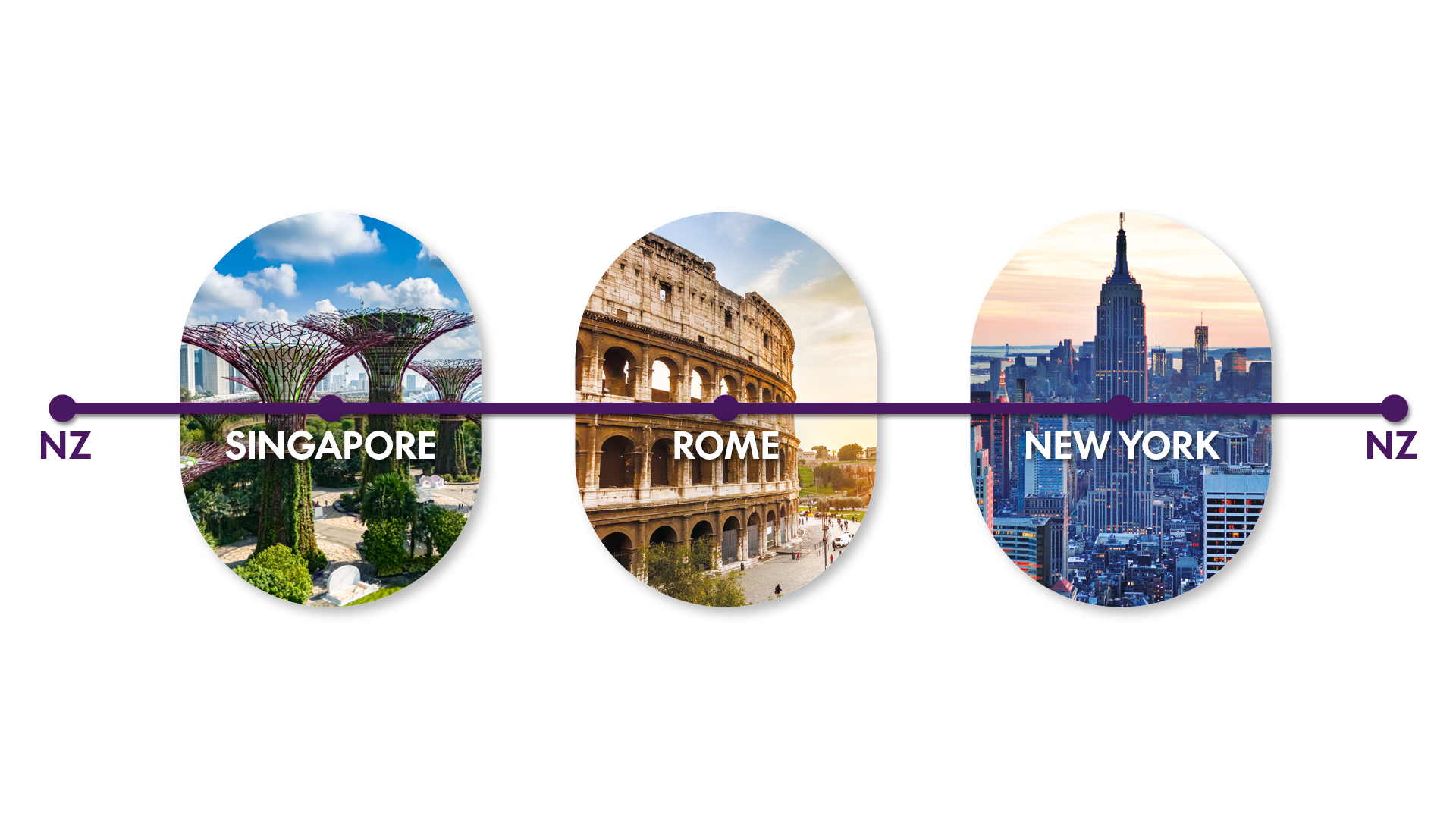 Auckland, Singapore, Rome, New York, Auckland
