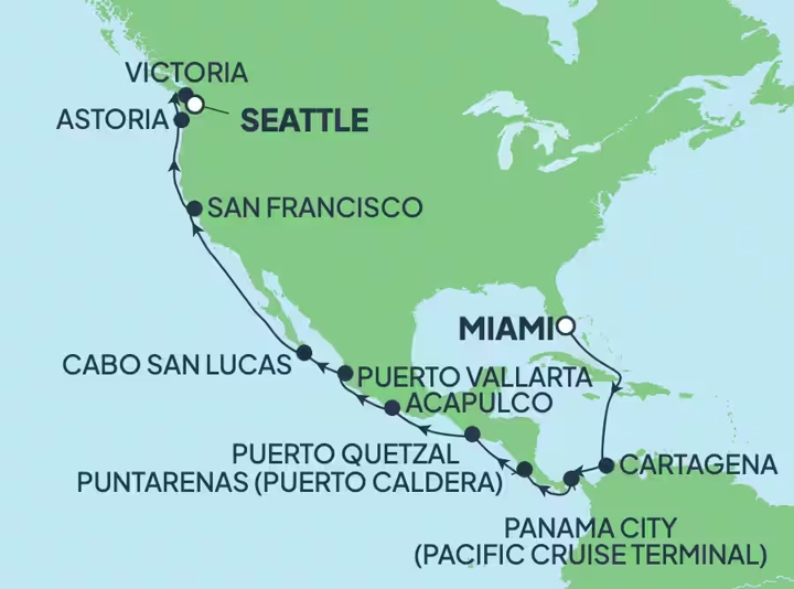 • 22 night cruise onboard Norwegian Encore® from Miami to Seattle