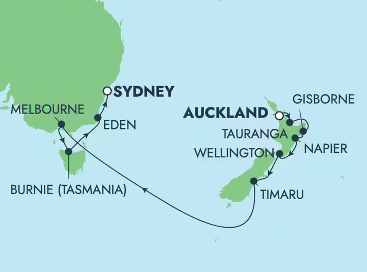 Journey along New Zealand’s East Coast, from lively cities to charming coastal towns, before unwinding on a Tasman Sea crossing. Discover cosmopolitan Melbourne, the wild beauty of Tasmania and picturesque Eden, before sailing into Sydney’s iconic harbour.