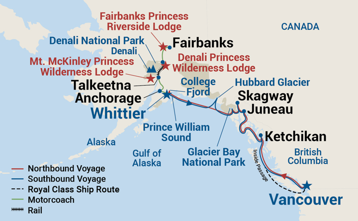 Upon arrival into Anchorage (Whittier) begin your escorted land tour which includes two nights each at three custom-built Princess Alaska Lodges. Strategically located, these lodges offer breathtaking views of Alaska's stunning landscape and provide a warm, welcoming base after a day of adventure and exploration. Explore Denali National Park on the Tundra Wilderness Tour, where you may catch glimpses of Denali and the park's "Big Five" - moose, caribou, bears, wolves and Dall sheep. Try your luck panning for gold on the Gold Dredge 8 Tour, and cruise down the Chena River on board an authentic sternwheeler riverboat.