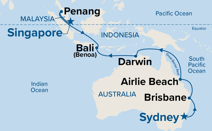 Explore a world of coastlines, culture and tropical paradise with Grand Princess on an 18-night journey from Sydney to Singapore. Cruise up Australia’s east coast — from the relaxed vibes of Brisbane and Airlie Beach to the tropical wilds of Darwin. Then sail across to Asia, enjoying stunning Bali and historic Penang before arriving in Singapore. It’s the ultimate mix of beach escapes, vibrant destinations and easy-going cruising.