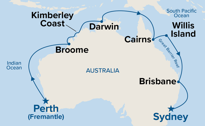 Set sail from Fremantle to Sydney and discover Australia’s spectacular coastline. Cruise past the dramatic Kimberley region, visit iconic destinations including Darwin and Cairns, and take in the diverse landscapes and vibrant coastal cities that make this journey truly unforgettable.