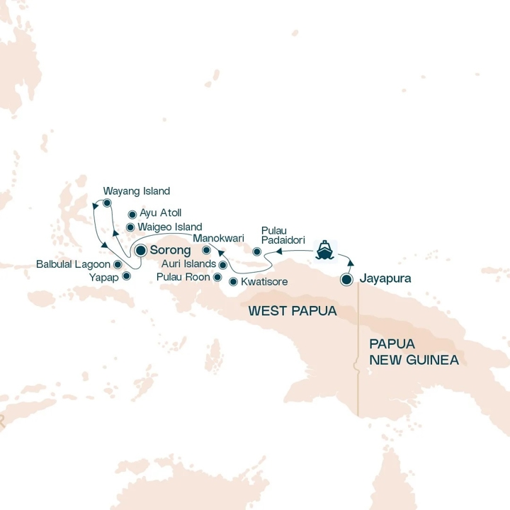 Pulau Padaidori is one of a cluster of tiny, mostly uninhabited islands and atolls off the northern Papuan coast. This remote stop combines secluded Pacific Rim beaches with a rich, protected marine ecosystem in its calm sapphire waters, where schools of shimmering tropical fish weave amid colourful coral gardens. Mangrove forests shelter snakes and crabs in their twisted root systems and swaying coconut palms decorate white-sand beaches.