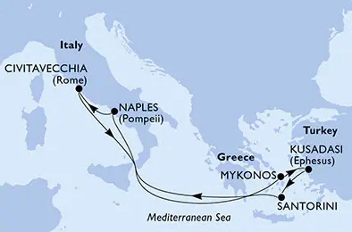 From the historic port of Civitavecchia, this journey weaves through the heart of the Mediterranean, blending ancient cities with stunning island beauty. After a peaceful day at sea, whitewashed villages await in Mykonos, followed by the cultural richness of Kusadasi and the breathtaking views of Santorini. Another relaxing sea day leads to Naples, where the ruins of Pompeii offer a glimpse into the past. The voyage concludes back in Civitavecchia, enriched by a perfect balance of relaxation and timeless destinations.