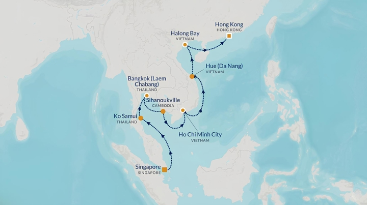 This voyage highlights Southeast Asia at its most rewarding. This cruise carries you from Singapore to Hong Kong, with rich stops along the way. Bangkok offers a full overnight to enjoy its sights, while Vietnam adds depth with time in Ho Chi Minh City, Hue, and scenic Halong Bay. In Cambodia, relax in Sihanoukville before heading north. With multiple overnight stays, you’ll have more chances to linger, discover, and enjoy each destination at an unhurried pace.