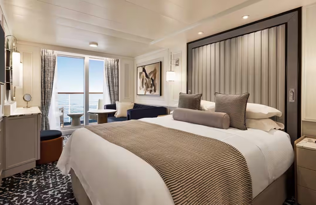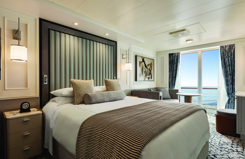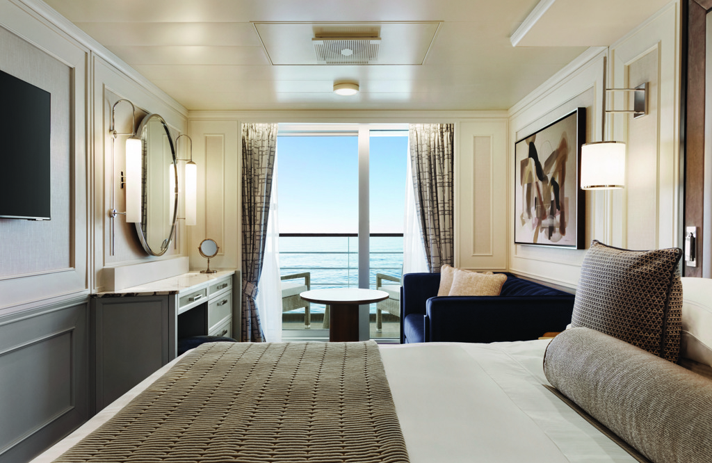 Coveted 291-square-foot Veranda Staterooms, among the most generous at sea, have been imbued with sumptuous new furnishings in calming hues to create the ultimate sanctuary. There is ample room for leisurely pursuits, including a furnished private teak veranda. Indulgent amenities are plentiful, such as dazzling new lighting, an inviting seating area, refrigerated mini-bar, generous closet and a marble- and granite-sheathed bathroom showcasing new additional storage and an expanded walk-in shower.