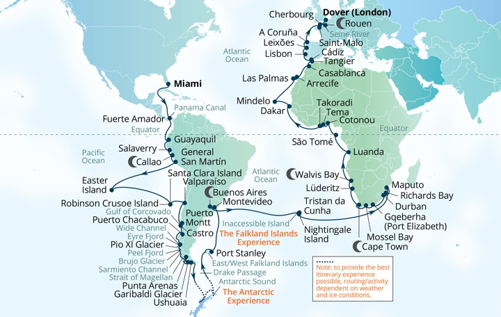 Set sail on Seabourn’s ultra-luxury Cape to Cape World Cruise, an immersive 120 night odyssey visiting the globe’s most compelling places — from the engineering marvel of the Panama Canal and remote Easter Island to the ice fields of Antarctica and the storied shores of South Africa. Experience diverse cultures, unforgettable wildlife encounters, and hidden gems found off the beaten path, while savouring the refined comfort, impeccable service, and elegant atmosphere of your luxurious ship.