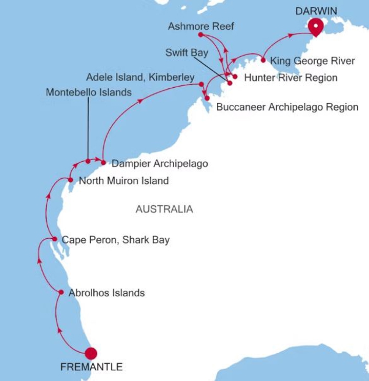 Experience the wild beauty of Australia’s northwest on this extraordinary voyage from Darwin to Fremantle. Journey through remote islands, ancient river gorges, and untouched reefs — from the dramatic cliffs of King George River to the pristine waters of the Montebello and Abrolhos Islands. Each day unveils breathtaking scenery, rich marine life, and unique natural wonders that define this remarkable coastal adventure.