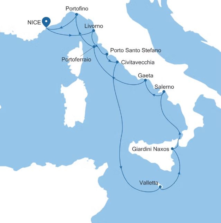 Begin your Mediterranean adventure in Nice and trace Italy’s most captivating coastlines, from the art and flavours of Tuscany to the historic heart of Rome. Wander through Porto Santo Stefano, enjoy a leisurely day at sea, then take in Malta’s golden-hued Valletta, Sicily’s scenic Giardini Naxos, and the southern charm of Salerno and Gaeta. Elegant island calls in Elba and the postcard-perfect harbour of Portofino complete a beautifully balanced return to the French Riviera.