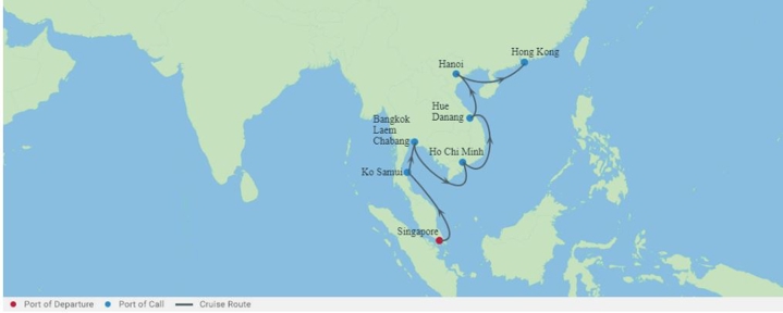 Start your holiday in vibrant Singapore before the calm of the open sea leads you to the island charm of Ko Samui and the bustling energy of Bangkok. Continue through Southeast Asia with culture-rich stops in Ho Chi Minh City and the historic gateway of Hue/Danang, then enjoy two days discovering the beauty of Hanoi. Your journey concludes in dynamic Hong Kong — a fitting finale to an itinerary filled with flavour, colour, and unforgettable moments.