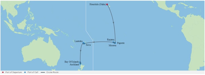 From the tropical beauty of Honolulu, journey across the vast Pacific toward the enchanting islands of French Polynesia, where Tahiti, Moorea, and Raiatea await with their turquoise lagoons and lush peaks. Continue on to the vibrant culture of Fiji, then sail south to the breathtaking Bay of Islands before arriving in Auckland, New Zealand. This remarkable voyage blends island escapes, ocean crossings, and unforgettable destinations.