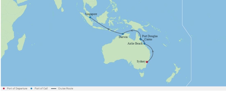 Begin your adventure in Sydney and let the journey take you along Australia’s stunning east and northern coasts. Relax on tranquil sea days before reaching the tropical splendour of Airlie Beach, Cairns, and Port Douglas. Continue onward to the vibrant city of Darwin before crossing into Southeast Asia, with the bustling city-state of Singapore as your unforgettable finale.