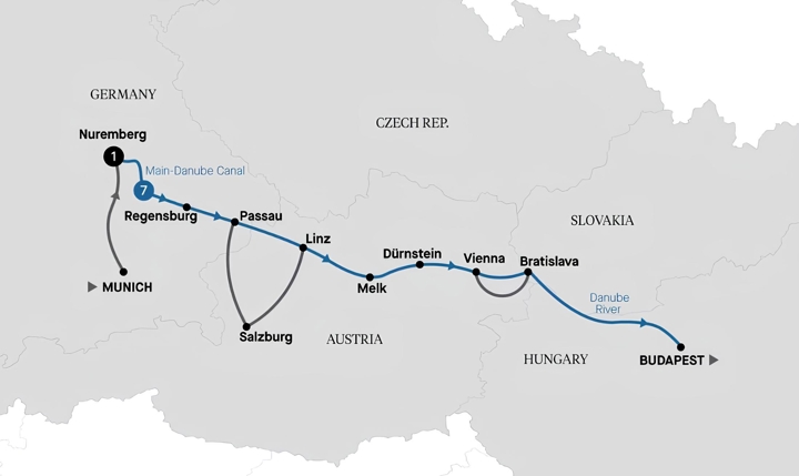 This morning, join a guided tour of Nuremberg. After your tour, board your river ship and settle into your suite. This afternoon, cruise along the Main-Danube Canal while indulging in a Bavarian beer, sausage and pretzel tasting on the Daystar Deck. Having taken 32 years to construct, the canal links the North and Black seas.
