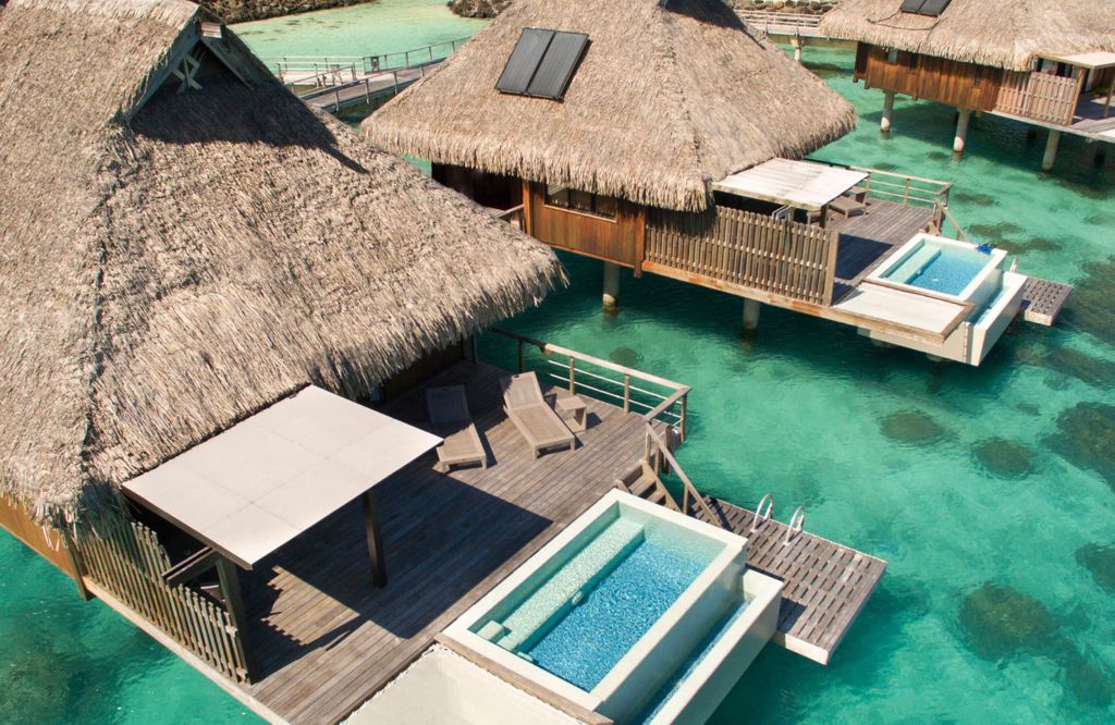 Hilton Moorea Lagoon Resort & Spa - King Panoramic Overwater Bungalow: Set further along the pontoon for added privacy Polynesian-style bungalow suite offers lagoon views, a private sun deck with direct access, a king-sized bed, and a marble bathroom with a rain shower and claw-foot bathtub. Conrad Bora Bora Nui - Overwater Pool Villa: Offers horizon and lagoon views, a private infinity pool, direct lagoon access, and indoor-outdoor living with a spacious terrace, overwater hammock, and sun loungers.