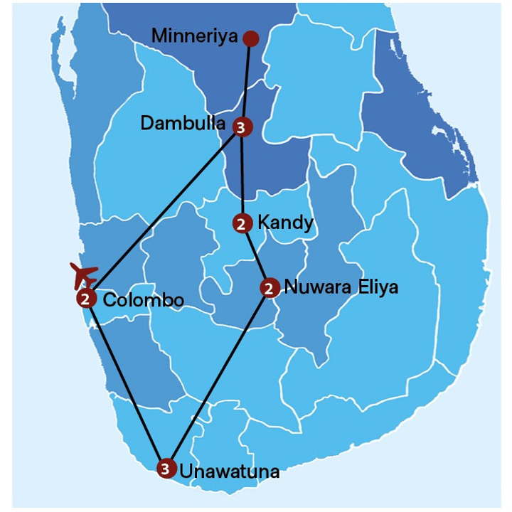 Explore this superb destination, visiting the ancient cities and UNESCO World Heritage Sites of Sigiriya and Dambulla and spotting wild elephants, reptiles and birds in Minneriya National Park. Enjoy the bustling city of Kandy where you may explore the Temple of the Tooth Relic and the magnificent Peredeniya Botanical Gardens. Travel to Nuwara Eliya and enjoy the misty experience of the tea gardens there. Finish your holiday with a spectacular beach stay and feel the accomplishment of having covering all the major highlights of Sri Lanka.