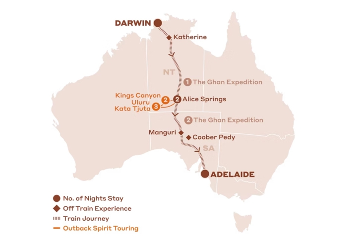 - Off train experiences in Katherine, Alice Springs, and Coober Pedy