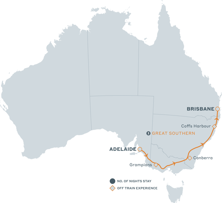 - 3 days/2 nights aboard Great Southern from Adelaide to Brisbane