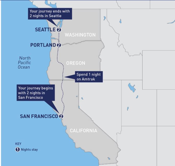 - 6 nights hotel accommodation (2 nights San Francisco, 2 nights Portland, 2 nights Seattle)